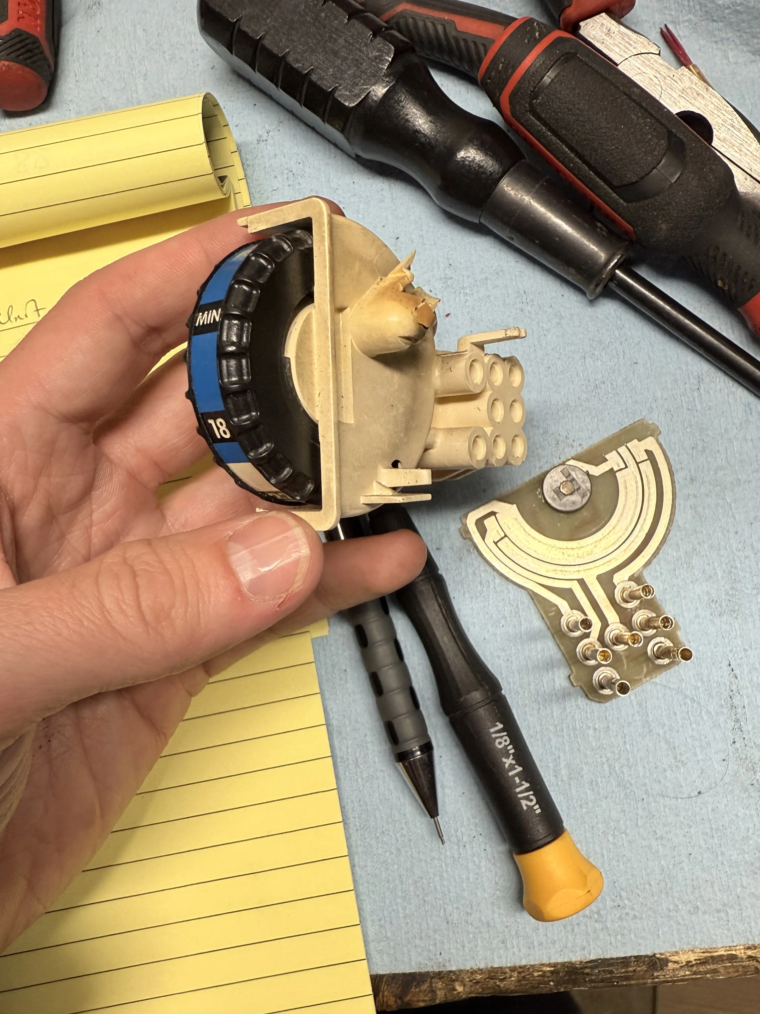 At the heart of this is a 10K potentiometer, made by RUF (now Bourns), with two little switches at either end to convey min temperature desired or max temperature desired. Nearly all the traces on the side of the board, visible in the photo, are actually nothing to do with the potentiometer, the exception being one trace coming from the potentiometer to which is complete when the selector is in the min position. I had thought that this potentiometer was out of tolerance, it’s probably nearing the end of its life but it’s not done yet.