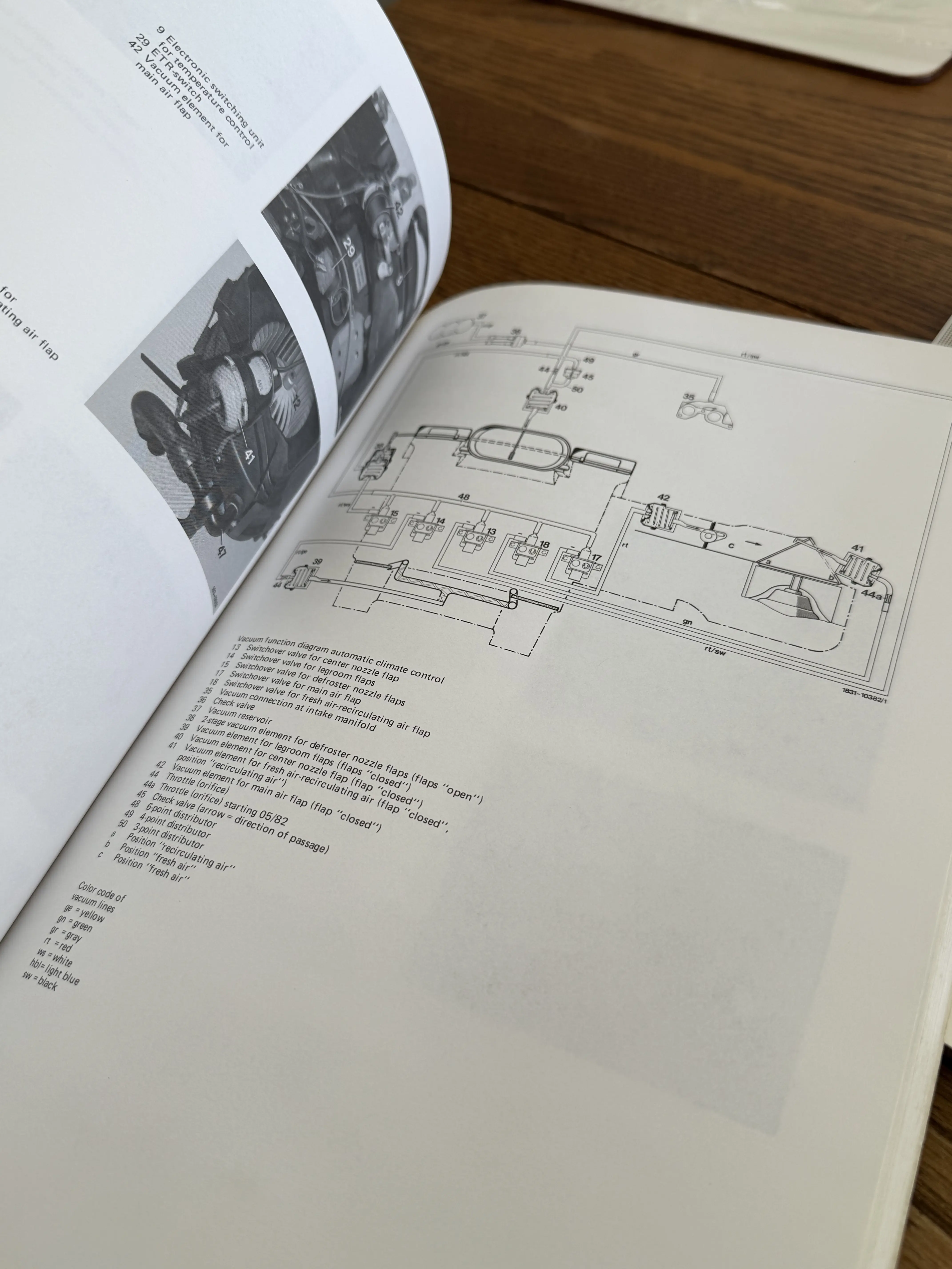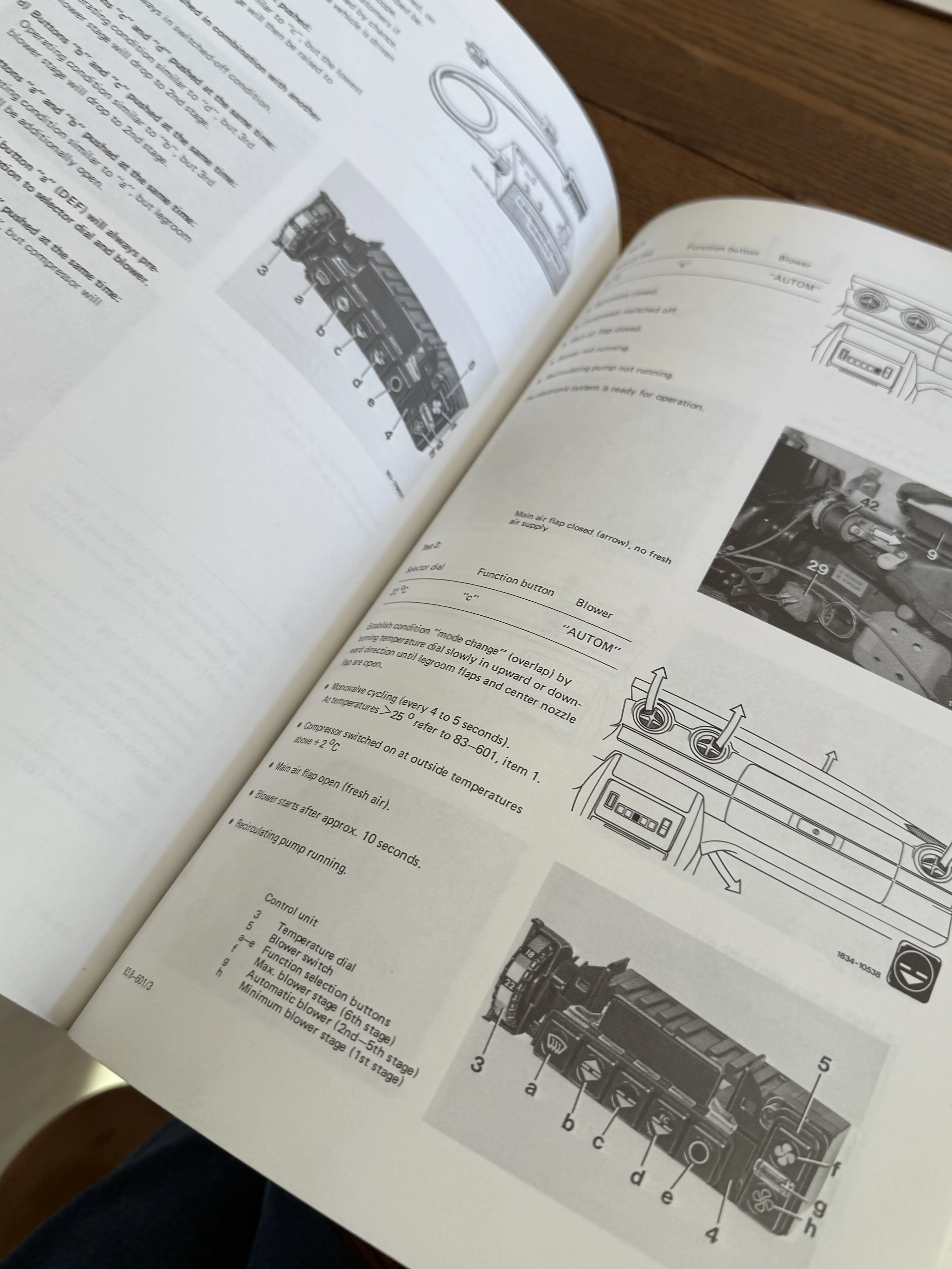 Plugging vacuum lines back in did make my buttons work and air come out of various vents, this was good but it was still red hot. I’d not really been worried by this because it was winter, but considering we’ve had the warmest winter for fifty years cold a/c is back on my mind. One night I was perusing eBay as one does, and stumbled upon a service manual for the W123 climate control systems for a good bargain. This book covers all three systems, the components in the cabin and in the engine bay, how to test each system just by using it and observing results, as well as using test equipment, then there’s the circuit diagrams showing wire colours and the vacuum diagrams that show where the vacuum is routed for each function. Over all this is a practical bible for anyone trying to reverse engineer these systems.